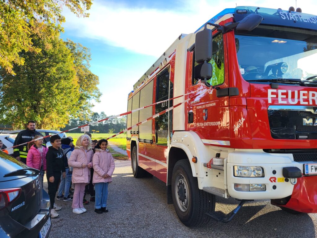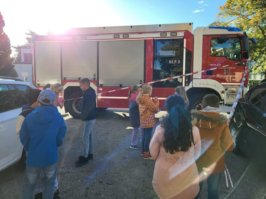 Am Donnerstag 17.10. kam die Polizei (und die Feuerwehr) für die jährliche Verkehrserziehung zu uns in die Schule. In der ersten Klasse wurde das Überqueren der Straße geübt, in der zweiten das richtige Überqueren zwischen zwei geparkten Autos. In der dritten Klasse wurde der tote Winkel erklärt.