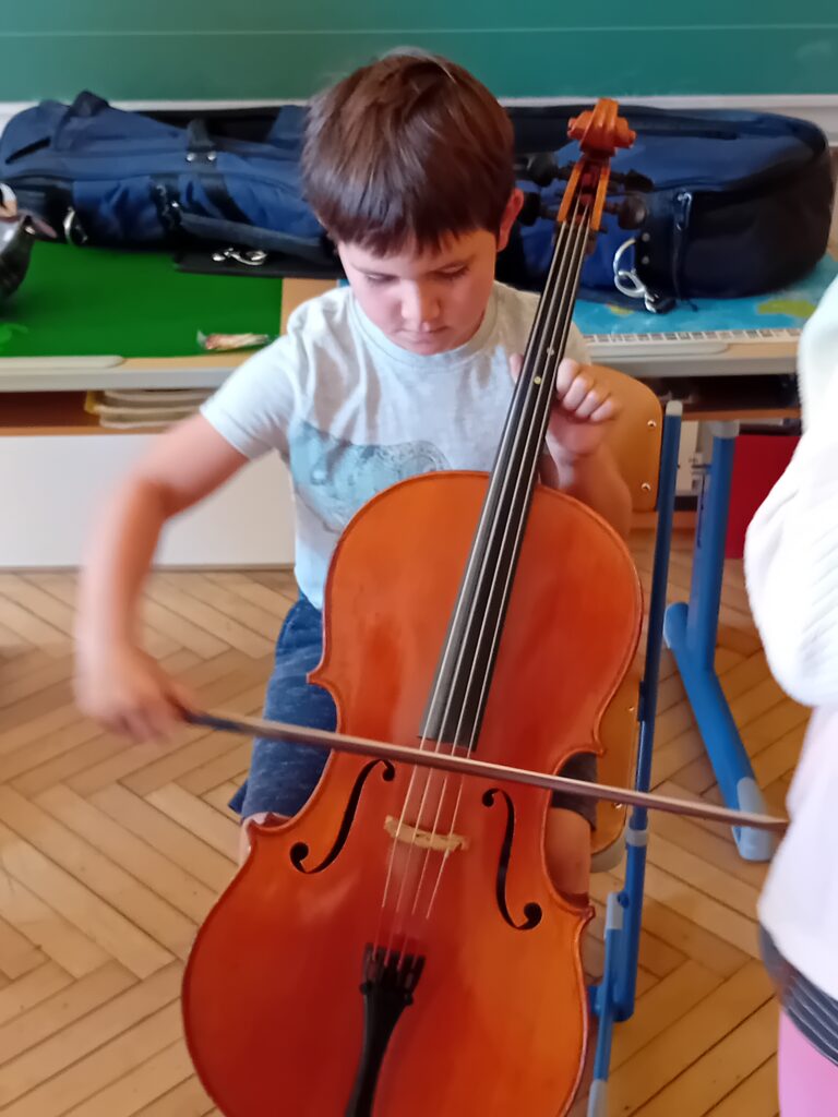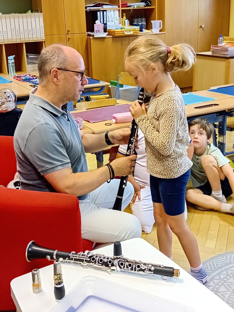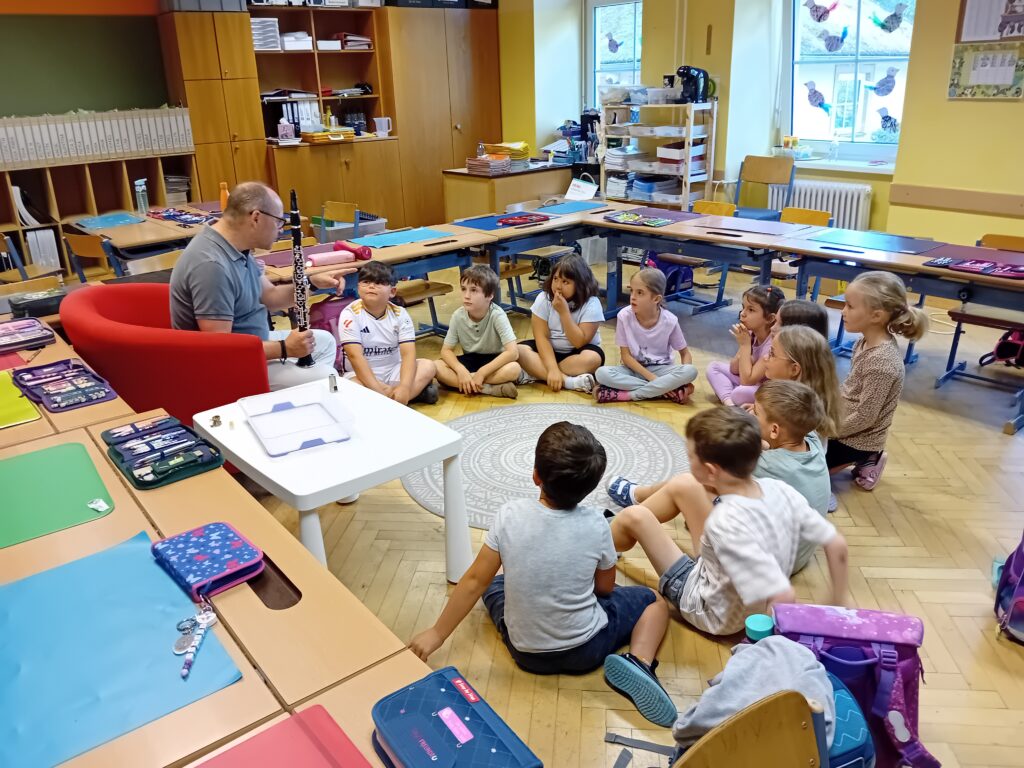 Zwei Lehrer der Musikschule sowie einige Musikschüler besuchten uns und stellten uns die Instrumente Klarinette und Saxofon sowie die Streichinstrumente Geige, Bratsche und Cello vor. Die Kinder probierten begeistert die Instrumente aus und glänzten mit Wissen, das sie im Musikunterricht bereits erworben hatten.