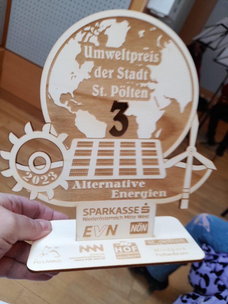 Beim Projektwettbewerb „erneuerbare Energien“ – dem Umweltpreis 2023 der Stadt Sankt Pölten – konnte die 4. Klasse den dritten Rang erreichen. Wir gewannen eine Woche Schulmilch, sowie einen Besuch im Windpark Pottenbrunn im Juni gewinnen.