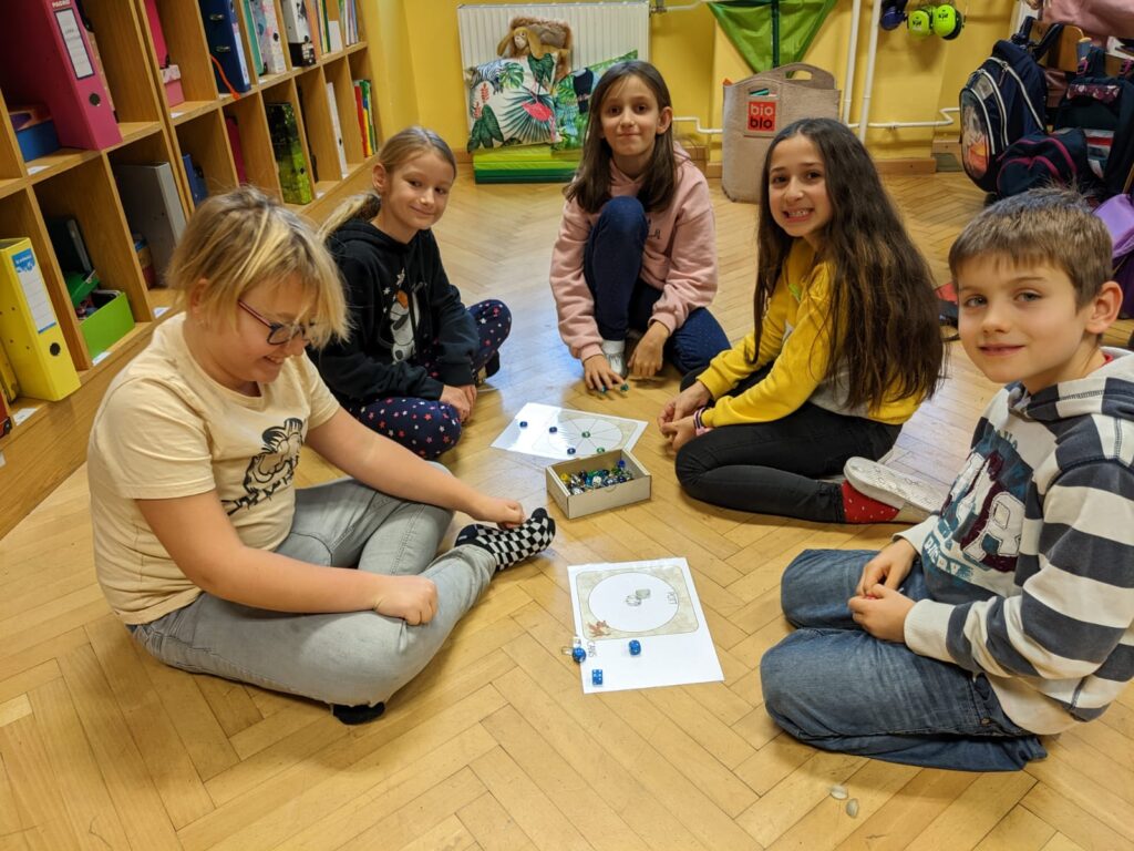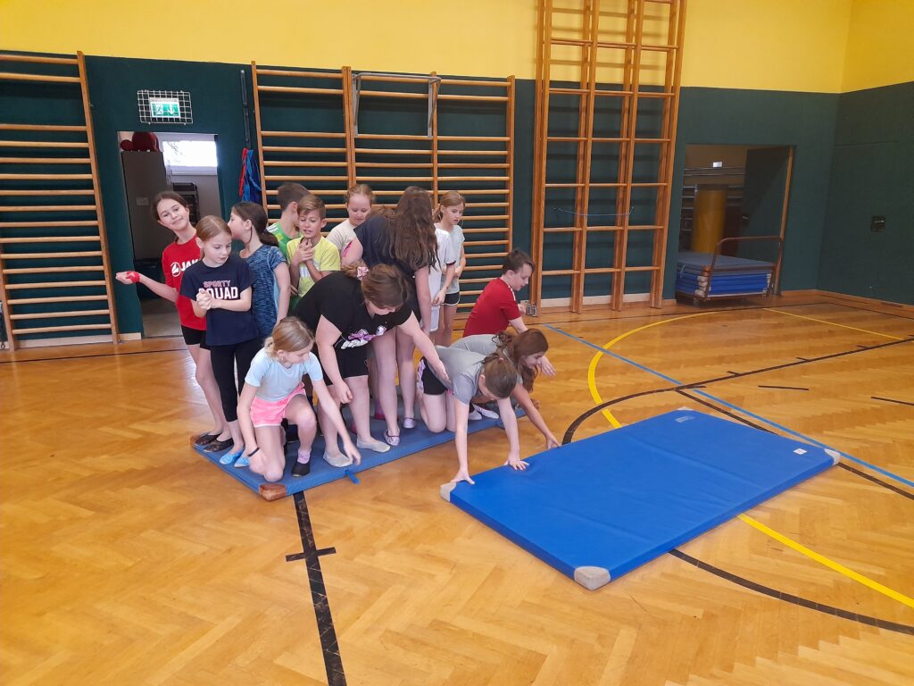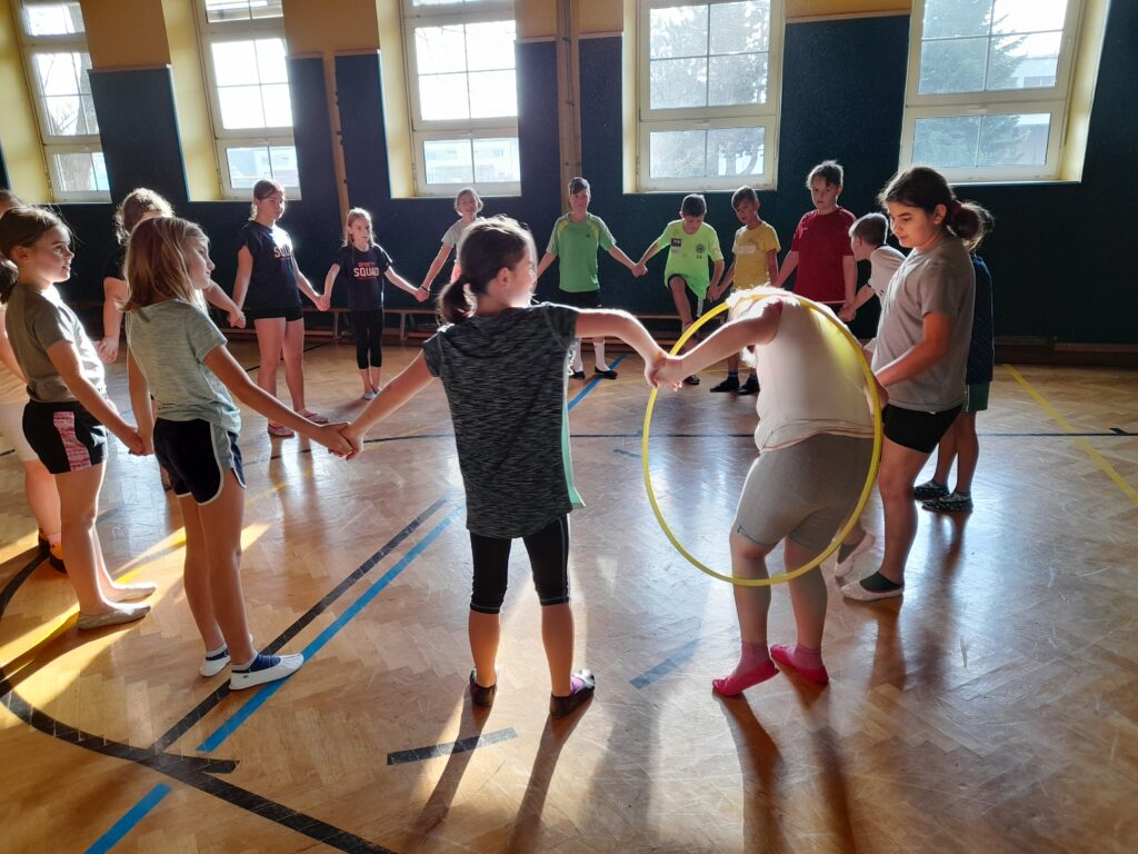 Problemlösen und Kooperation sind wichtige Fähigkeiten, die die Kinder lernen und erproben sollen. Im Turnunterricht der 4. Klasse galt es verschiedene Aufgaben zu lösen – mit zwei Matten ohne den Boden zu berühren vom einen Ende der Halle ans andere Ende zu gelangen, oder auch einen Reifen durch einen Kreis wandern zu lassen ohne die Hände zu lösen.