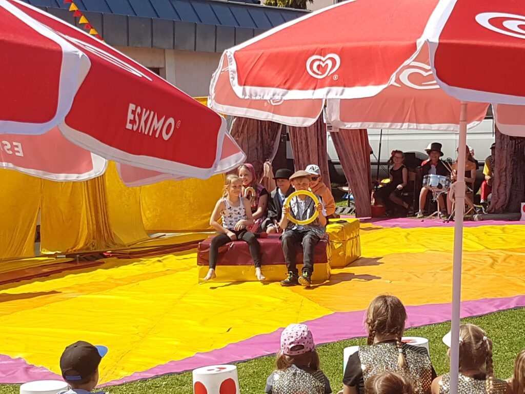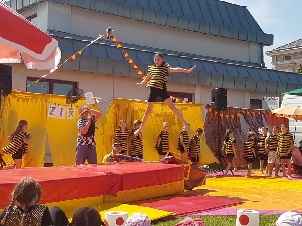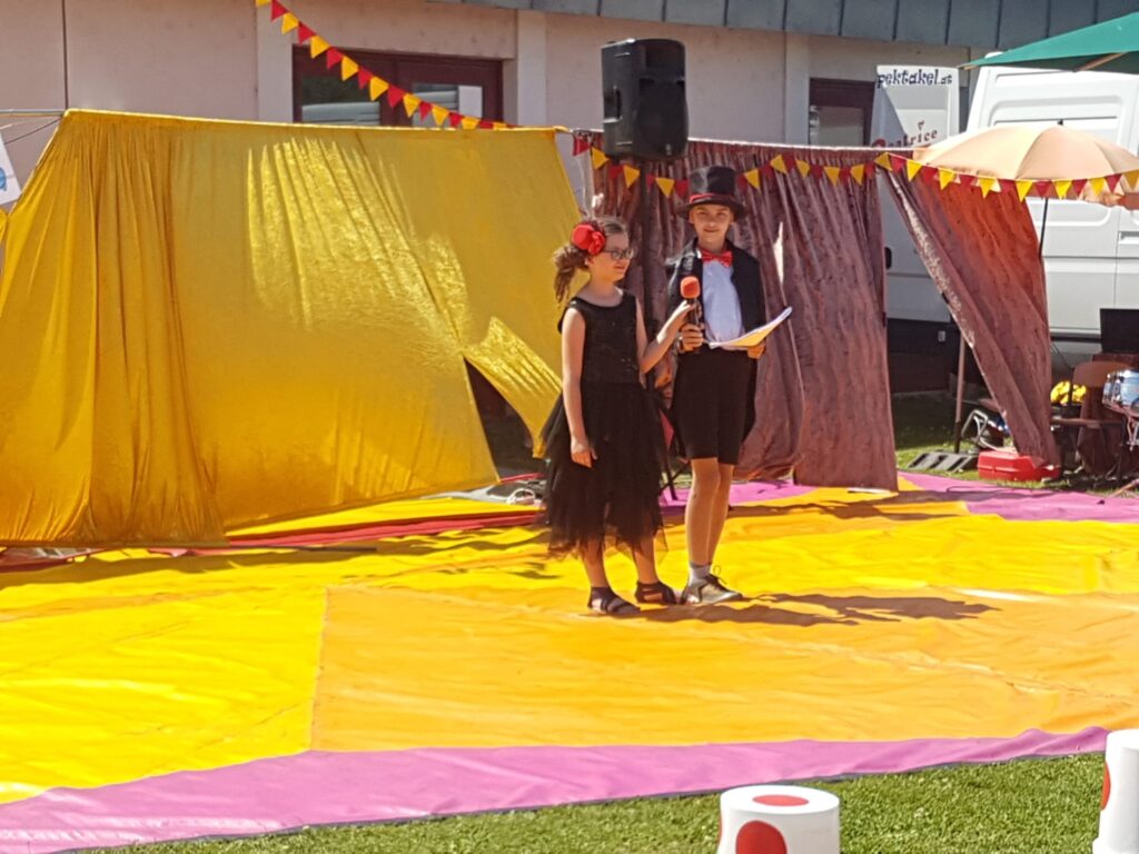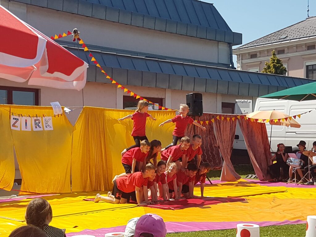 Sommerfest mit Zirkusvorstellung 3. Juni 2022VS StattersdorfSabine Eder Clownerie Minitrampolin Pyramidenbau und Akrobatik Moderation Ball-Jonglieren Hula Hoop Feuerbälle