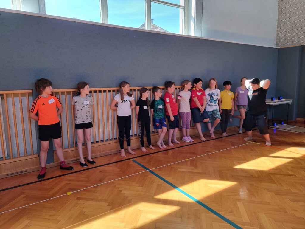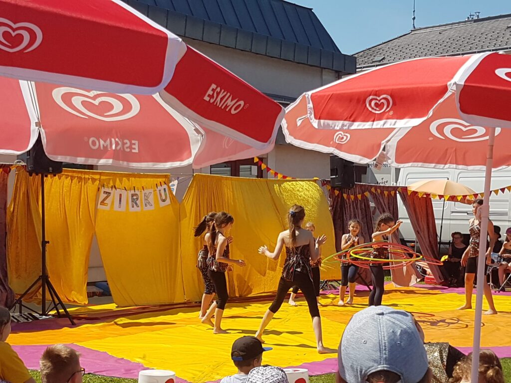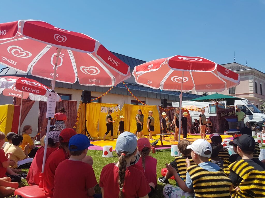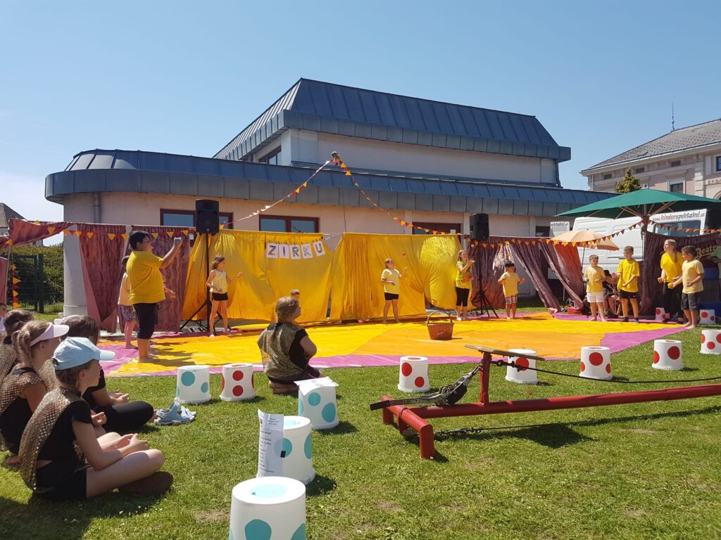 Sommerfest mit Zirkusvorstellung 3. Juni 2022VS StattersdorfSabine Eder Clownerie Minitrampolin Pyramidenbau und Akrobatik Moderation Ball-Jonglieren Hula Hoop Feuerbälle